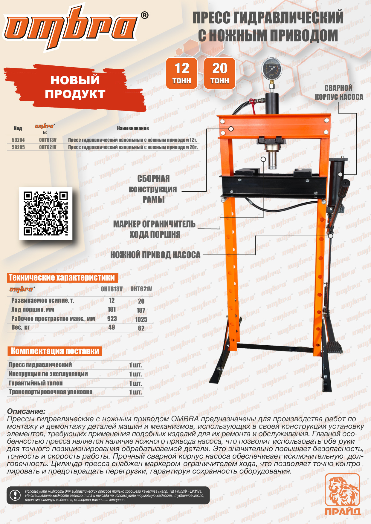 OHT621V Пресс гидравлический с ножным приводом 20т Ombra